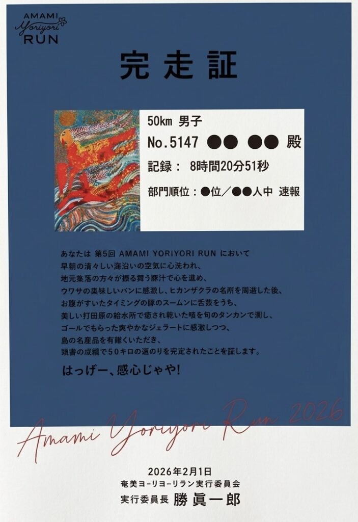 2026年2月1日。 奄美ヨーリヨーリラン 50kmの部。 私の記録です。 距離 53.47km 時間 8時間20分51秒 1km平均 9分23秒 時速 6.41km ※給水所・エイド5箇所、トイレ2箇所。 約15分の休憩時間を含みます。 ⸻ 50kmの部ですが、実際の距離は53.47km。 この数... -